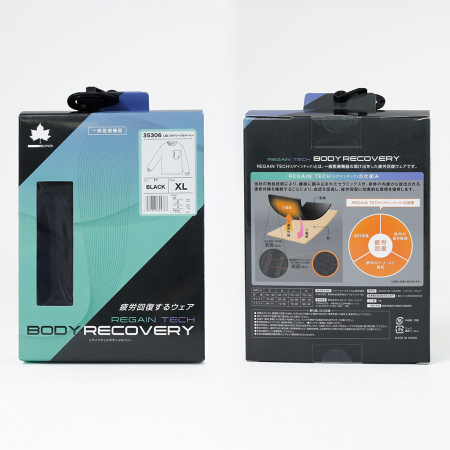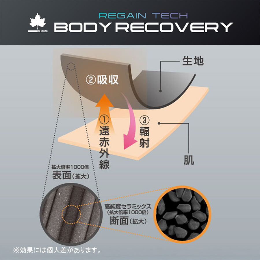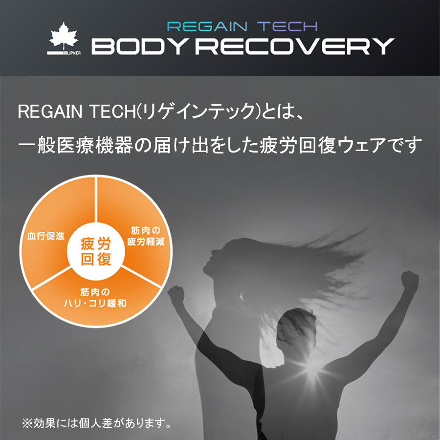 ポリエステルと綿を組み合わせた生地に、セラミックスを練り込んだ特殊加工を施した「REGAIN TECH(リゲインテック)」素材を採用。身体から発せられる遠赤外線を輻射し、血行促進や筋肉の疲労緩和、ハリやコリをほぐす効果が期待できます。一般医療機器として届出された機能性ウェアで、快適さとケアを同時に叶えます。