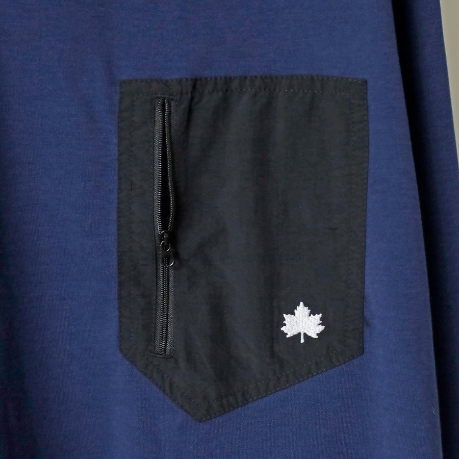 ベーシックなクルーネックの長袖Tシャツに、左胸のジッパー付きポケットをプラスした機能的なデザイン。ポケットにはブランドロゴがプリントされており、シンプルな中にアクセントを添えています。袖口はリブ仕様で、程よいフィット感を演出。カラーはブラックとネイビーの2色展開で、落ち着いた大人の雰囲気に仕上げています。