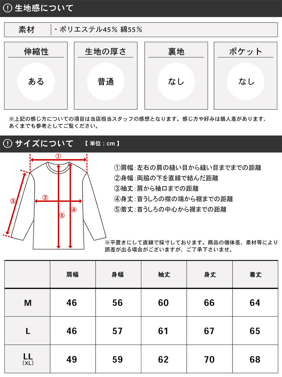 着丈64cm 身幅56cm 袖丈60cm 肩幅46cm 身丈66cm (下札表示対応サイズ)胸囲88~96cm