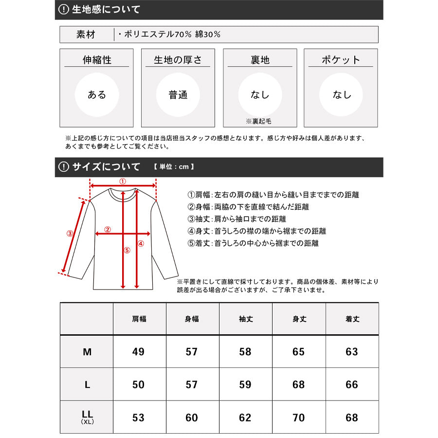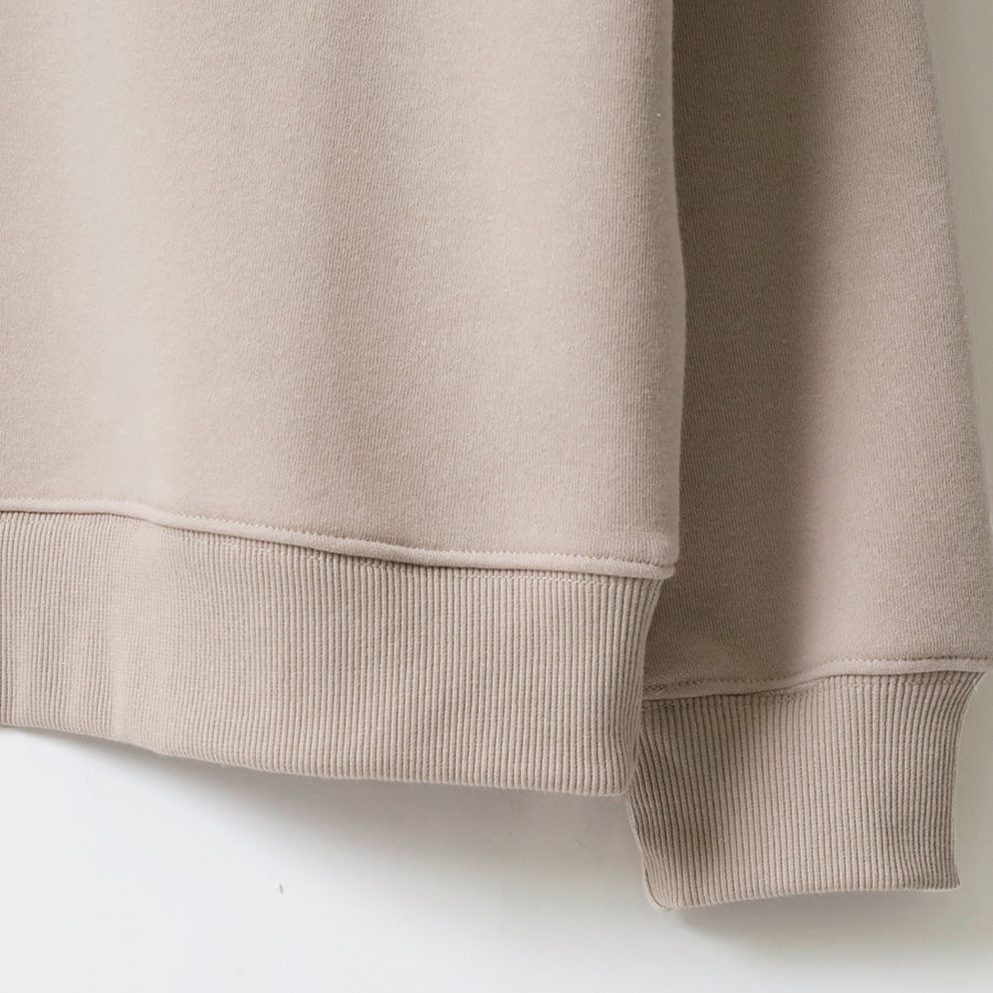 ふんわりとしていて程よい厚みのあるコットンとポリエステルを使用した裏起毛の素材になります。軽くて肌触りが良くロングシーズン着回すことができます。