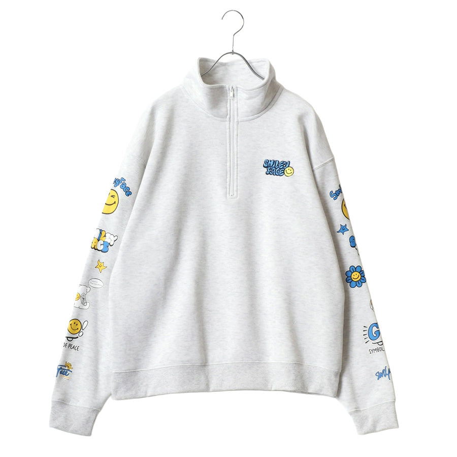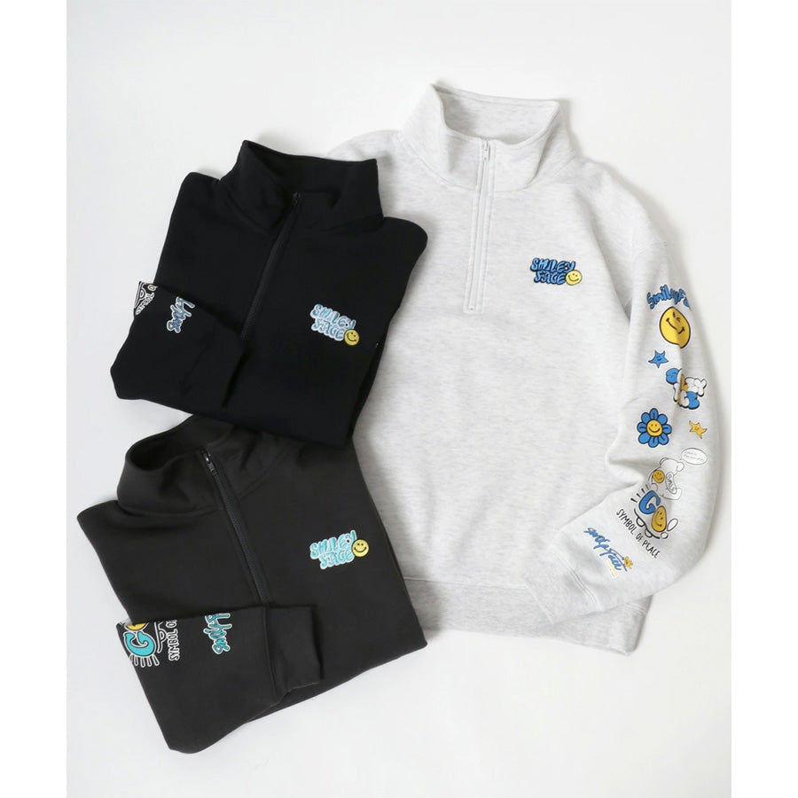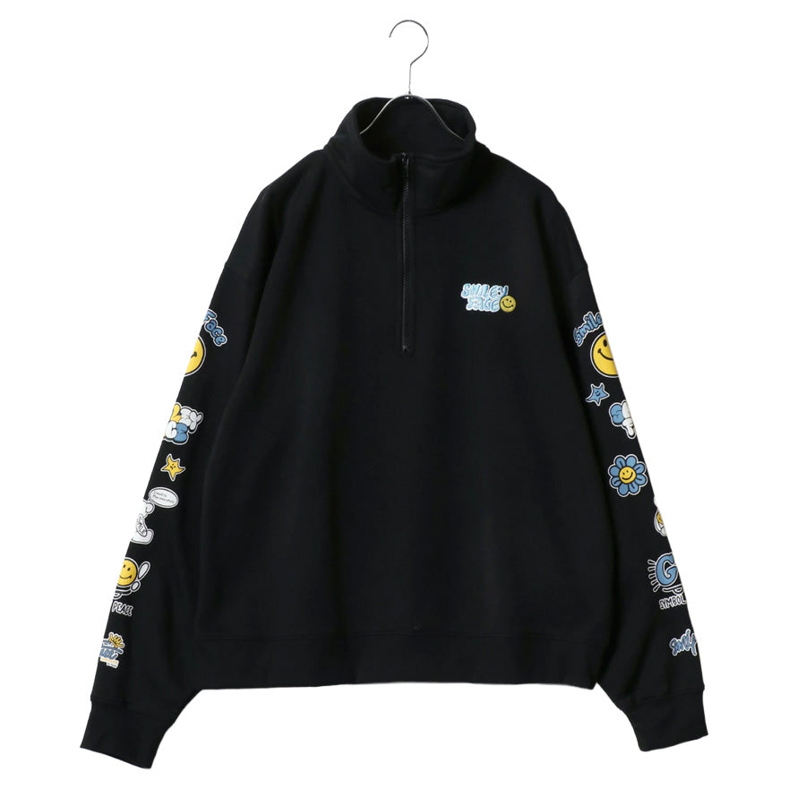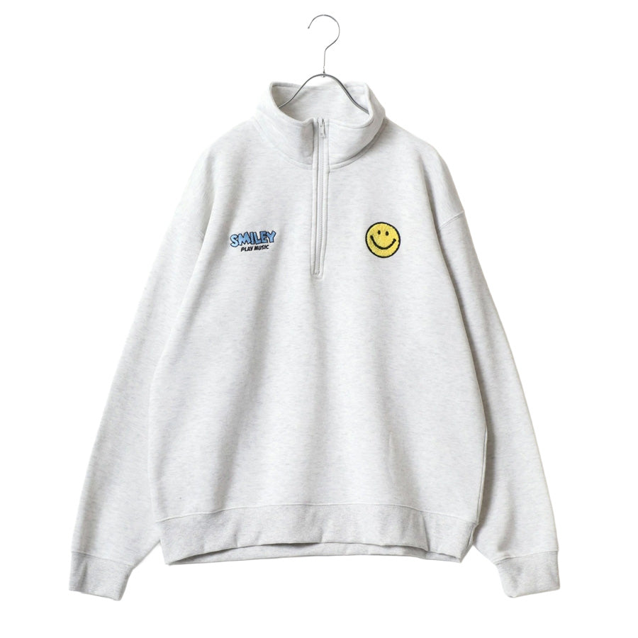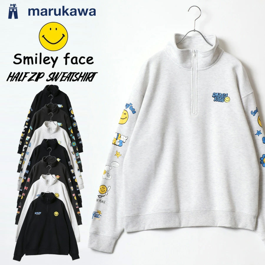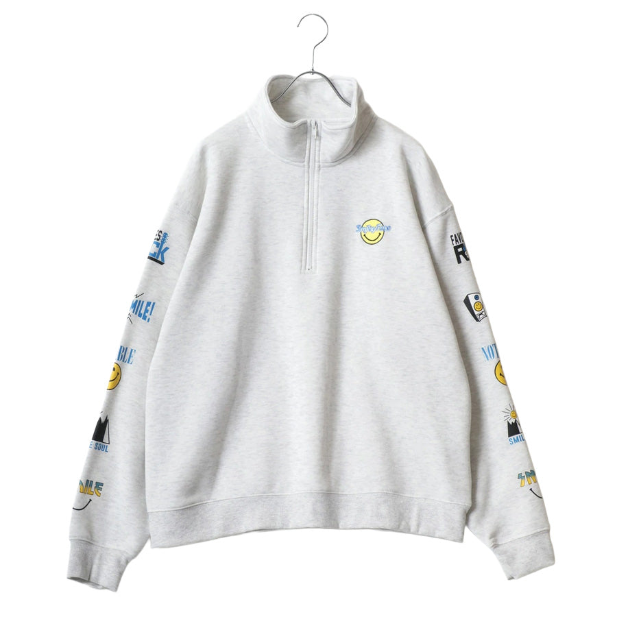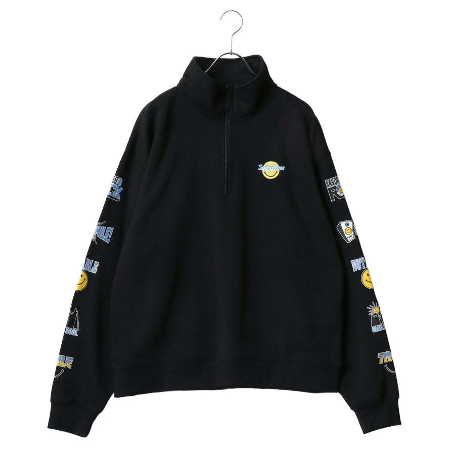 大人気のスマイリーフェイスハーフジップスウェットトレーナーの新作登場です。 右胸にロゴ刺繍、左胸にミニスマイリーサガラ刺繍/左胸にスマイルリーワンポイントロゴ+袖にスマイリーバナープリント/左胸ワンポイントロゴ+袖にスマイリーロックプリントの3デザイン展開です。 トレンドのビッグシルエットを採用、オーバーサイズで今風な着こなしを実現します。