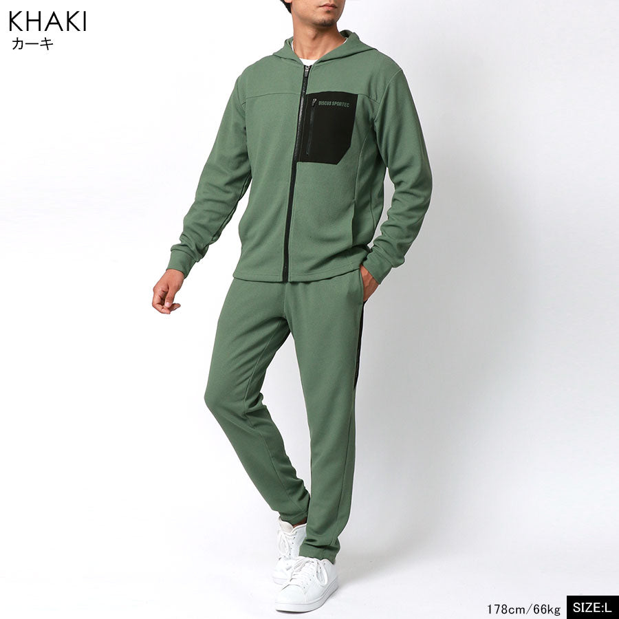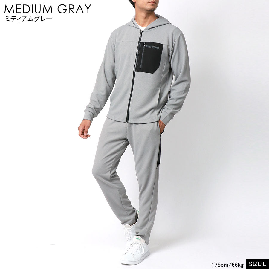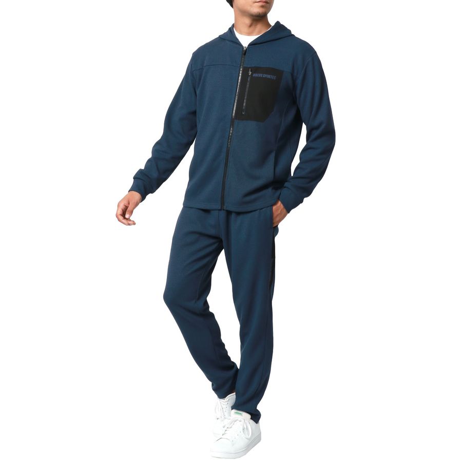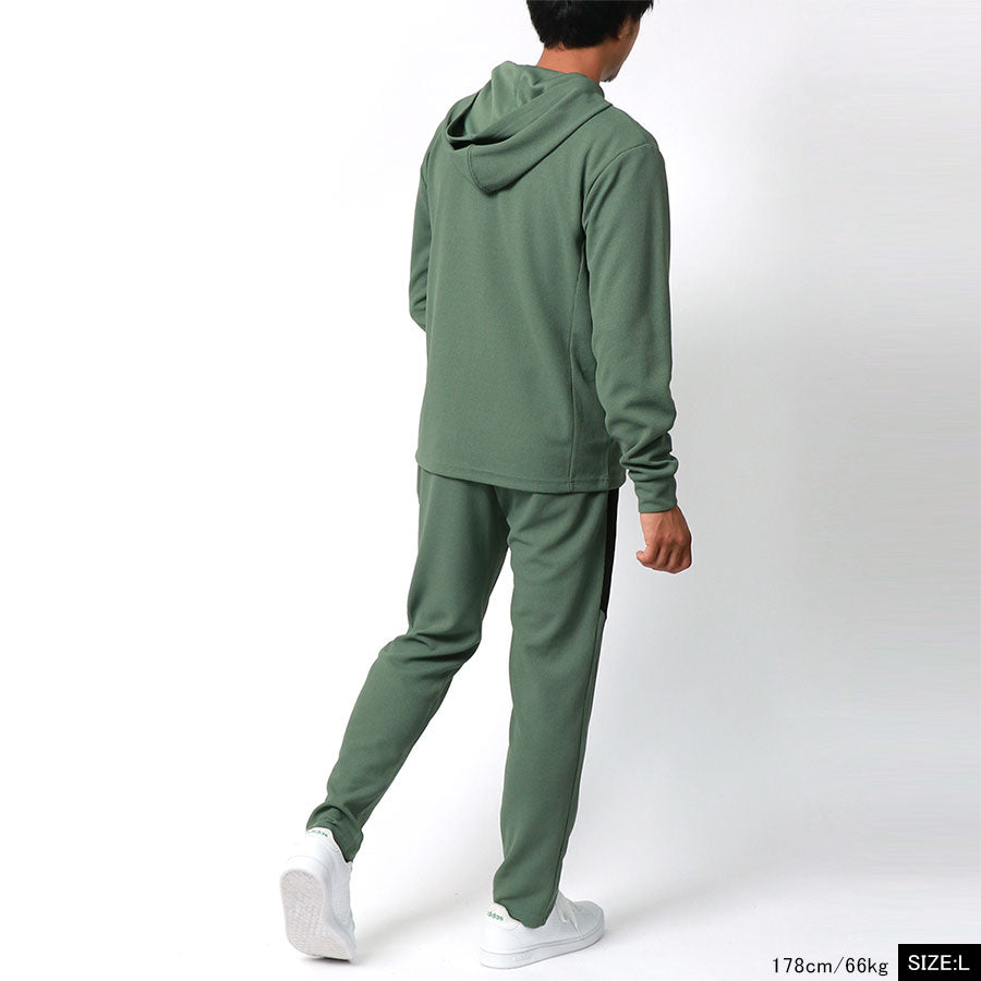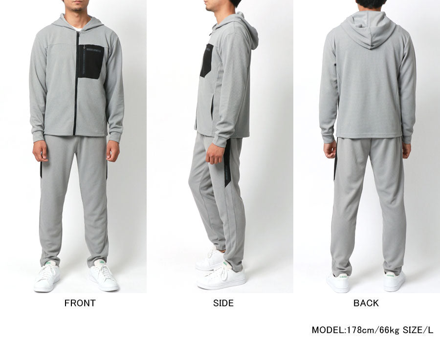 ・別布切替えデザインがさりげなく個性を演出するフルジップパーカー上下セット。ワッフル生地は伸縮性があり、さらにイージーウエスト仕様なのでリラックスした穿き心地なのも◎。吸汗速乾機能をプラスしたドライな素材を使用しているので、トレーニング着としても幅広く活躍してくれます。