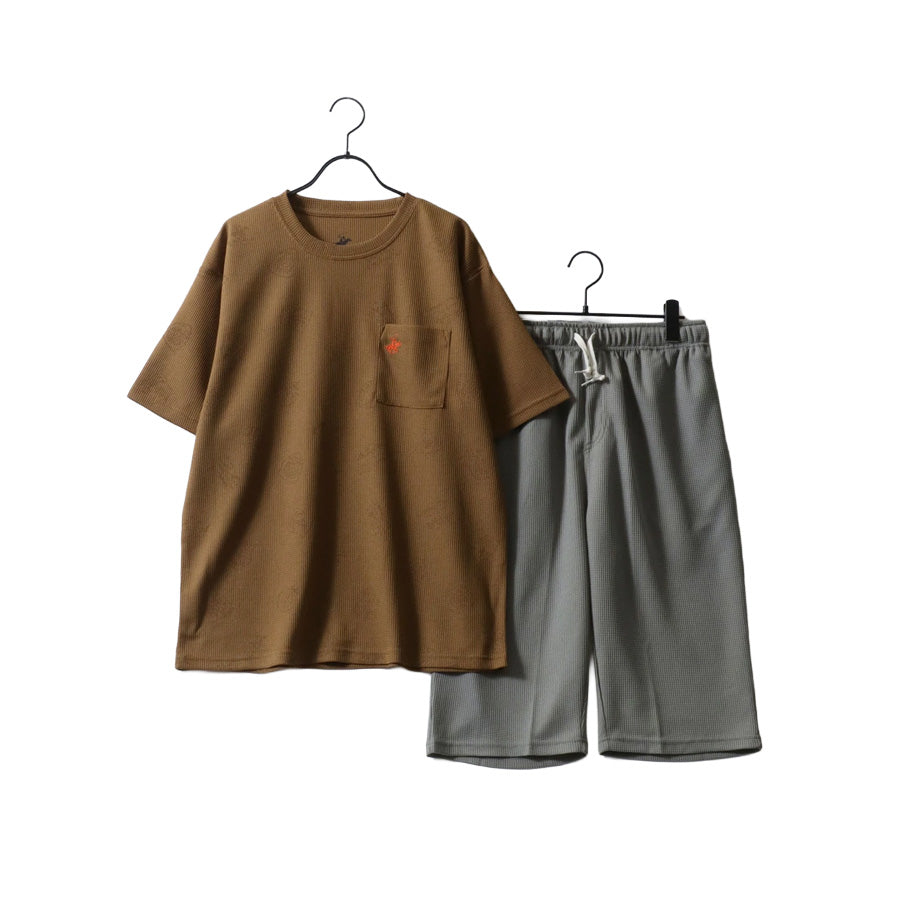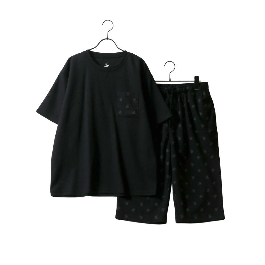無地ボディにブランドを象徴するホースロゴが散りばめられたポケットとハーフパンツがシンプル過ぎないデザインとなっております。いろんなブランドアイコンがデザインされた総柄Tシャツにシンプルな無地のハーフパンツの組み合わせが派手過ぎないバランスの取れたデザインとなっております