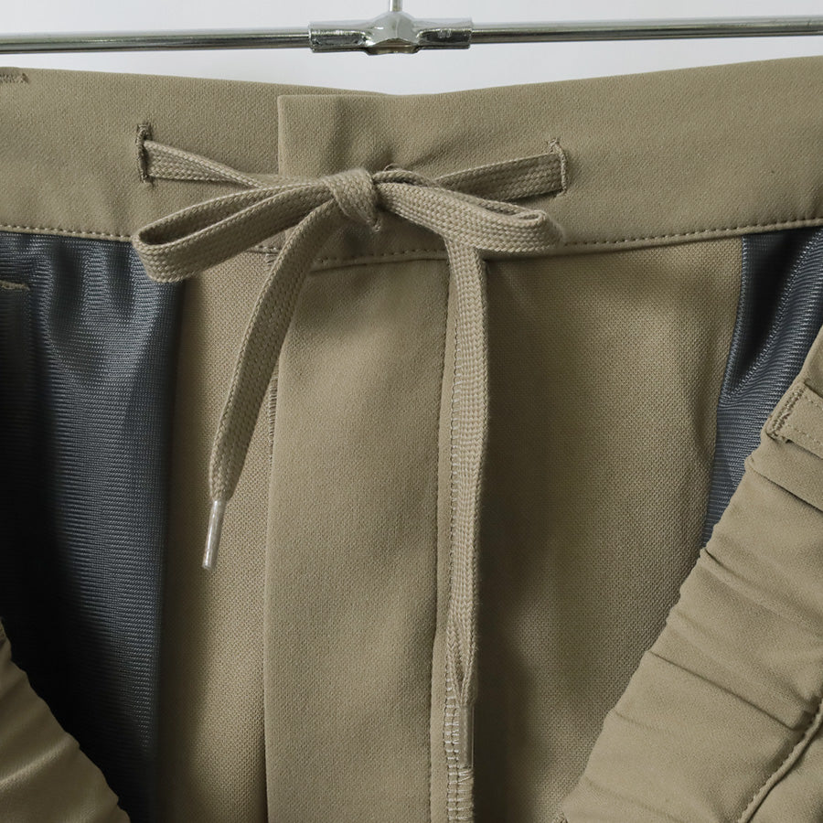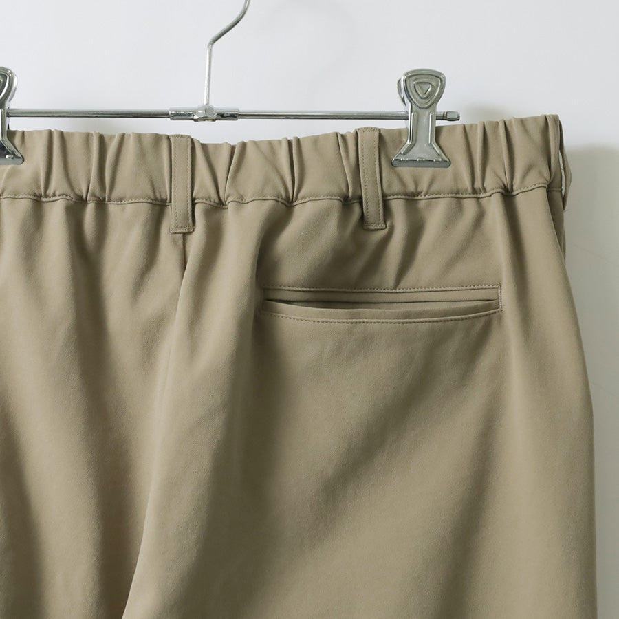 パンツはボタン+ジッパー仕様で、内側にはウエスト調整が可能な紐を内蔵。さらに、ウエスト後ろ部分はゴムシャーリング仕様となっており、フィット感と動きやすさを両立しています。ポケットはフロント2つ、バック1つを備え、日常使いにも便利。カラーはブラック、ベージュ、ネイビーの3色展開で、オン・オフどちらにも取り入れやすいラインナップです。