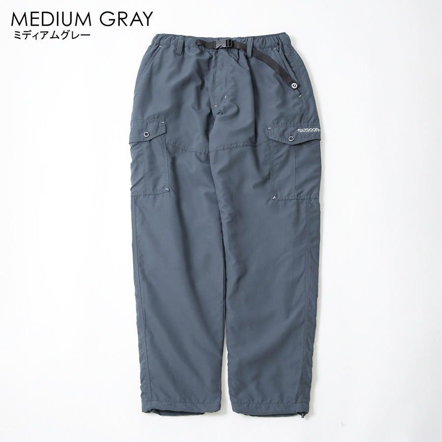 ゆとりのあるシルエットにカーゴポケットを配置し、機能性とデザイン性を兼ね備えたアウトドアスタイル。ウエストはゴム+ベルト仕様でフィット感を自在に調整可能。左サイドポケットには「OUTDOOR」のロゴ刺繍、右バックポケットにはブランドタグをあしらい、さりげないアクセントをプラスしています。裾にはドローコードを備え、シルエットの変化も楽しめます。カラーはミディアムグレー、ブラック、カーキ、オリーブの4色展開。