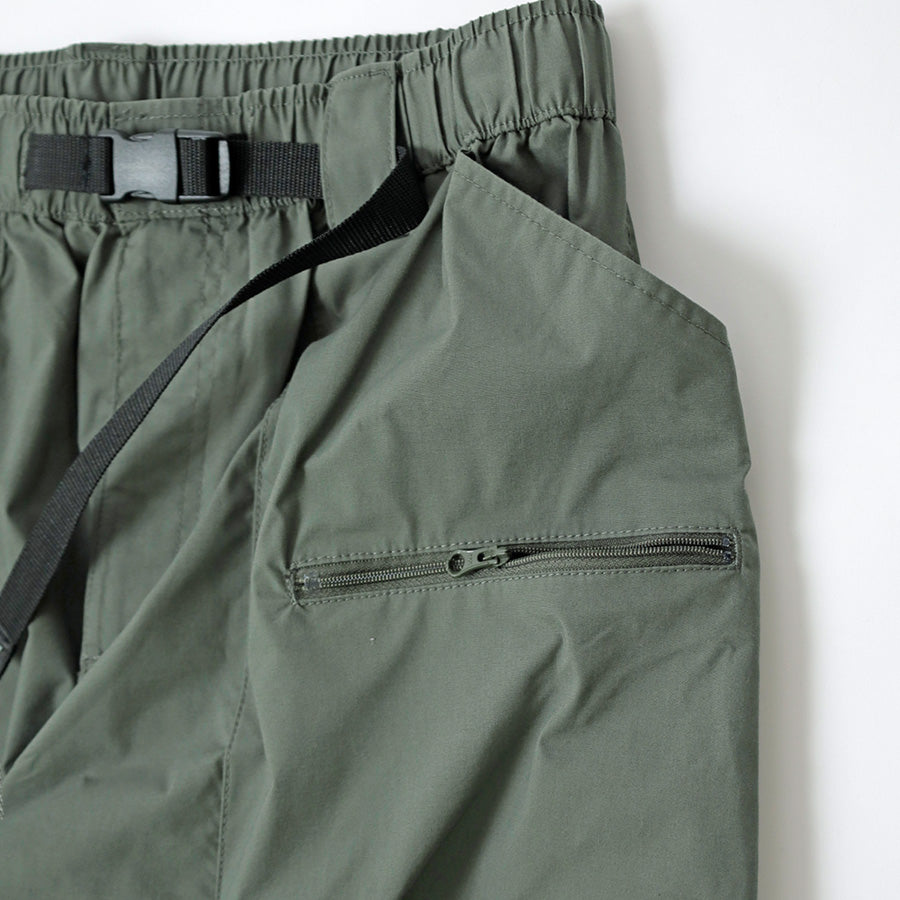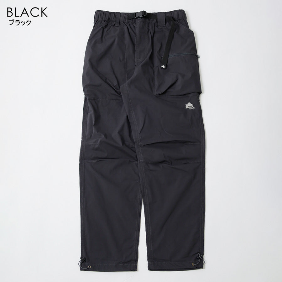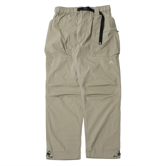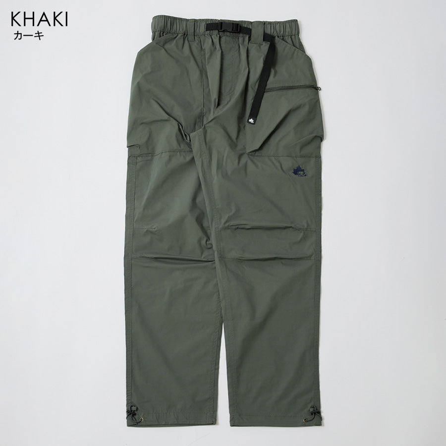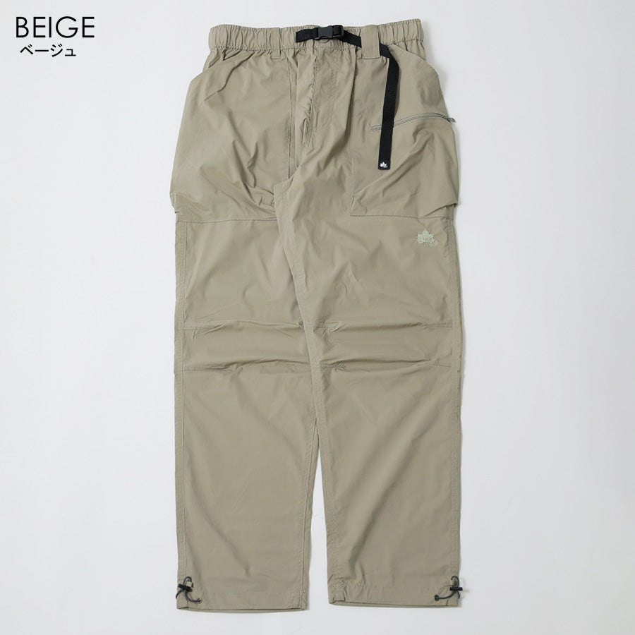 ウエストはゴム仕様に加えてベルト付きで、シーンに合わせた細かな調節が可能。ポケットはウエスト両側に加え、右サイドにジッパーポケット、バックにも1つ配し、必要な物を分類して持ち運べます。左前身には「LOGOS Park」のロゴ刺繍入りでさり気ないアクセントに。裾にはドローコードが仕込まれており、絞ることでシルエットに変化をつけたり風の侵入を抑えたりと、機能的な1本です。カラーはブラック/ベージュ/カーキの3色展開。