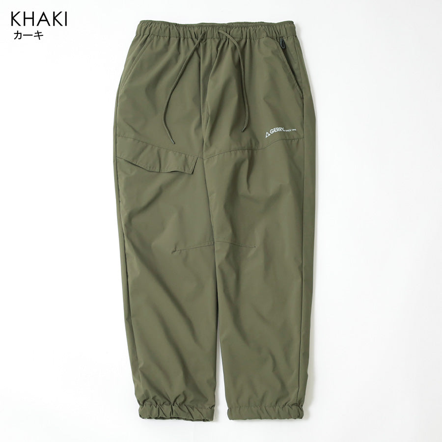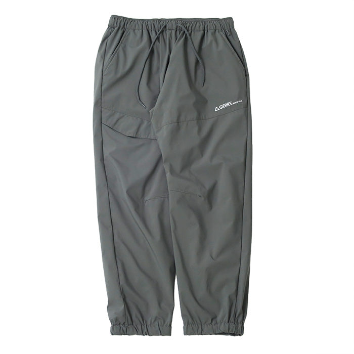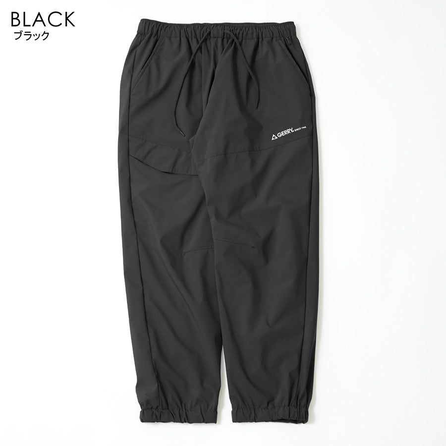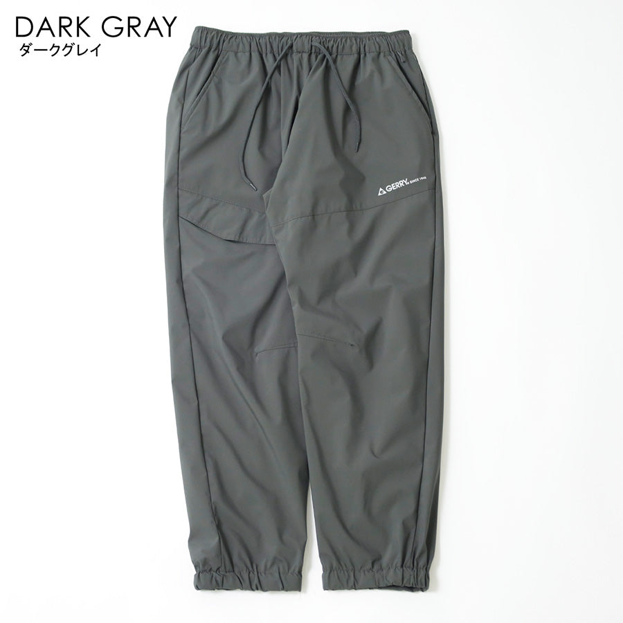 スポーティな印象のジョガーシルエットを採用し、裾のゴム仕様がすっきりとしたラインを演出。ウエストはゴム+紐でサイズ調整も簡単です。ポケットはフロント×2、バック×1に加え、右脚サイドにポケットを配置。アウトドアやレジャー時の収納にも便利です。左前には「GERRY」のロゴプリント、バックにはブランドタグを施し、デザインのアクセントに。カラーはダークグレイ、ブラック、カーキの3色展開です。