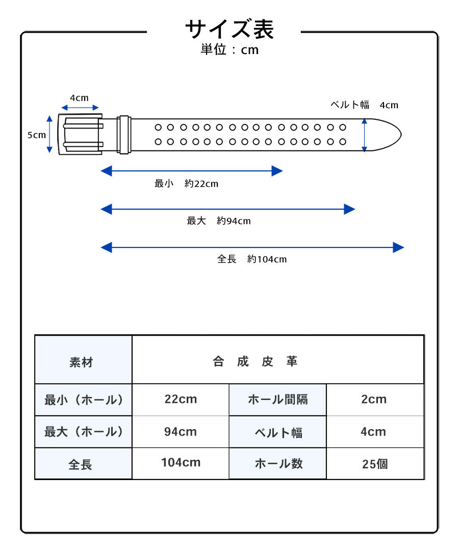 (約)ベルト幅 4cm ホール数 25個 ホール間隔 2cm