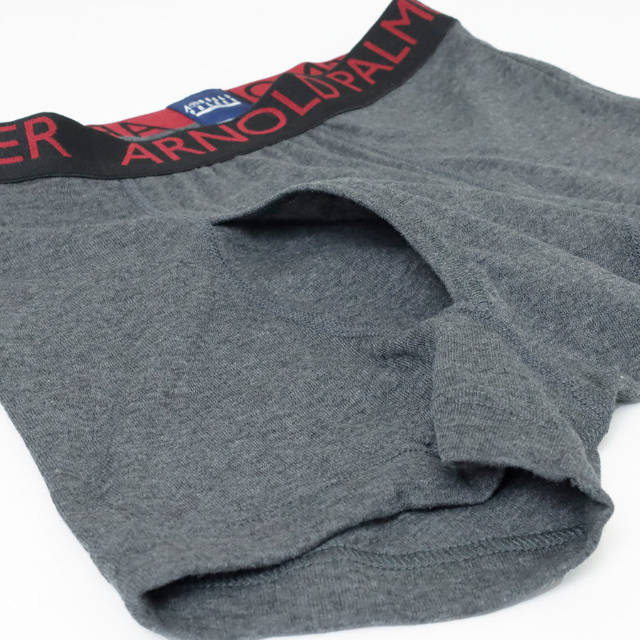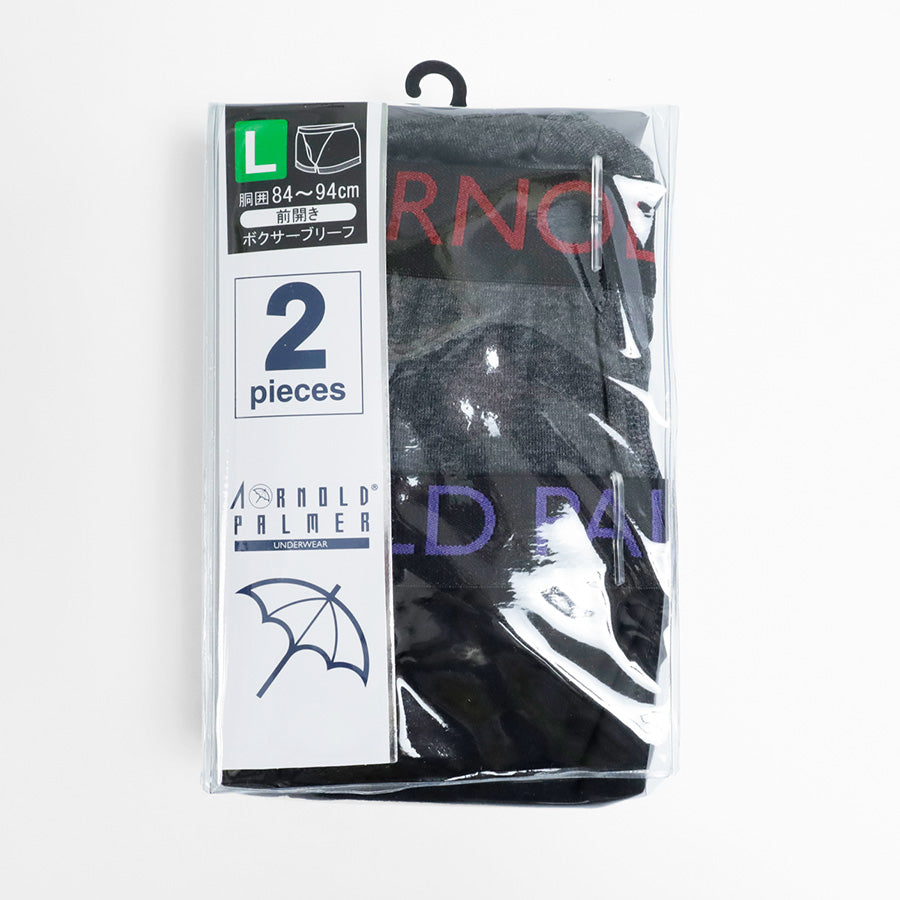 ベーシックで使いやすい前開き仕様のボクサーパンツを、2枚1組のセットでご用意。ウエストゴム部分には「Arnold Palmer」ロゴデザインをあしらい、シンプルな中にもブランドらしいアクセントをプラスしています。カラーはチャコール&ブラック、ネイビー&ブラックのセット展開で、毎日のローテーションに取り入れやすい組み合わせです。