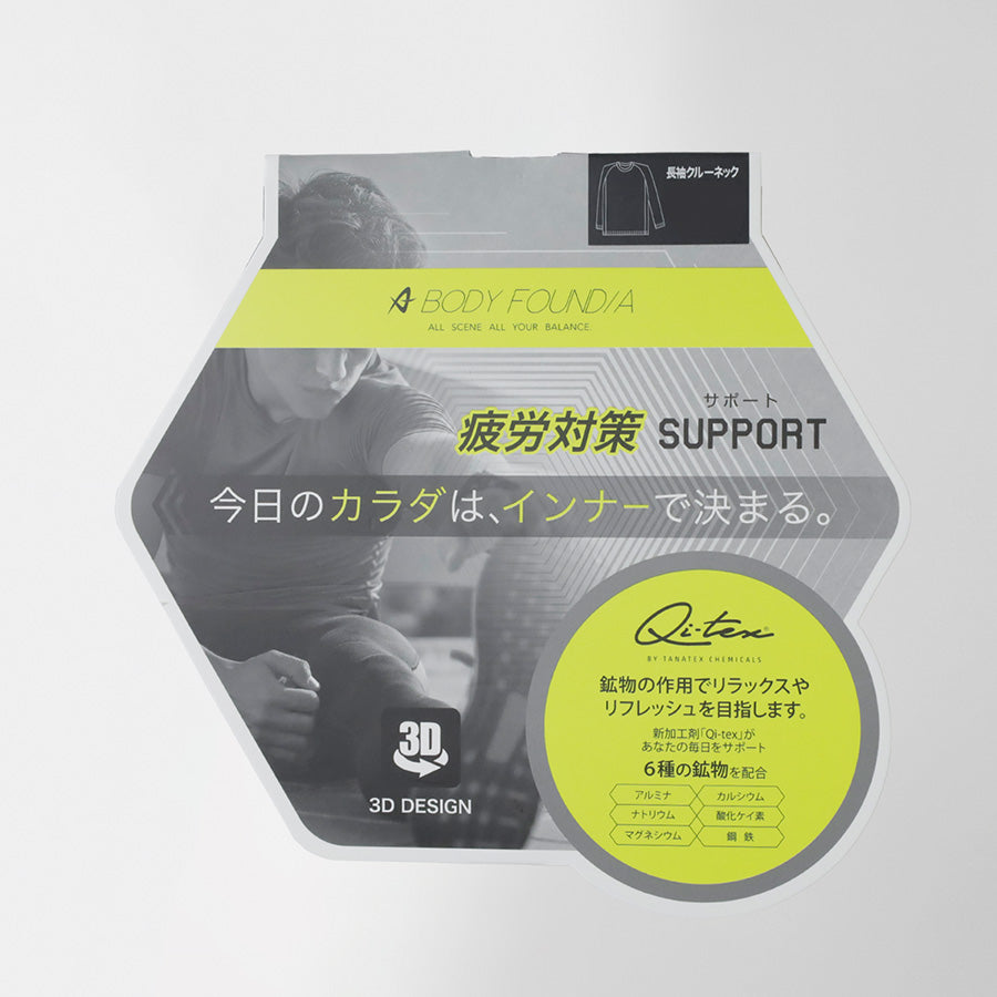 特殊加工「Qi-tex(チテックス)」を採用した長袖メンズインナー。アルミナ・カルシウム・ナトリウム・酸化ケイ素・マグネシウム・鋼鉄の6成分を配合し、人体から放出される赤外線を再放射することで、着用時のバランス調整やリフレッシュをサポートします。快適性と機能性を両立させた新感覚のインナーです。