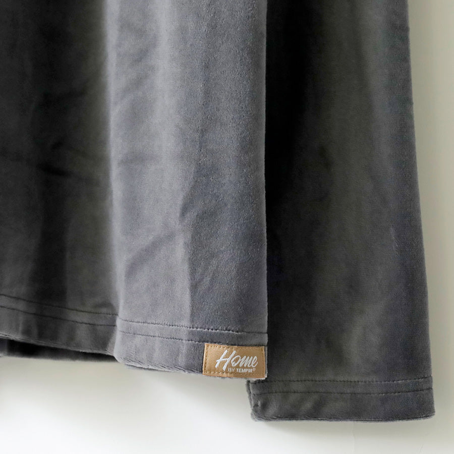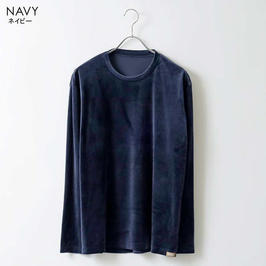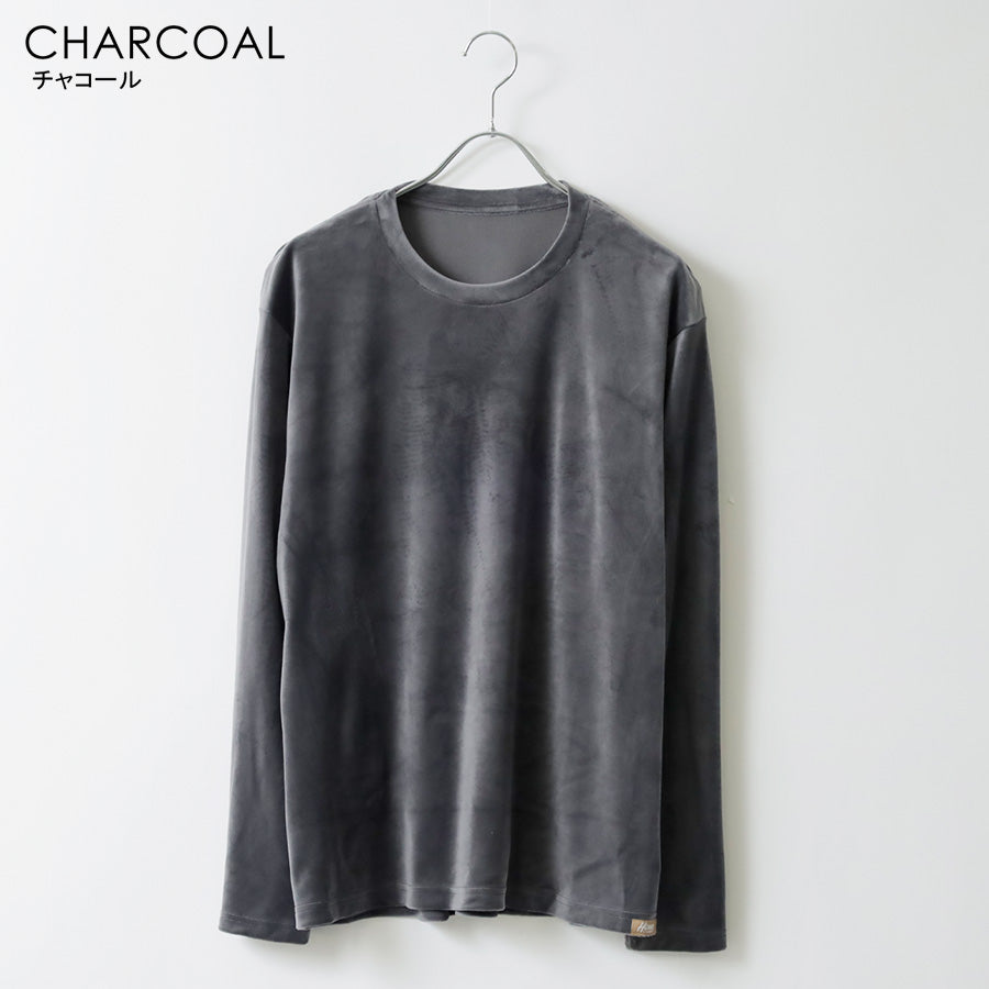 丸首仕様のシンプルな長袖トップス。ベロア調の上品な光沢がありながらも、着心地は軽やかで快適です。ややゆったりめのシルエットでストレスを感じにくく、リラックスタイムにぴったり。カラーは落ち着いたチャコールとネイビーの2色展開で、大人らしい落ち着きを演出します。