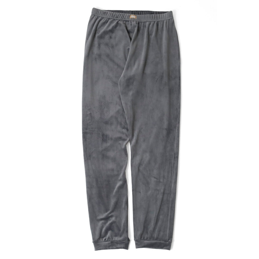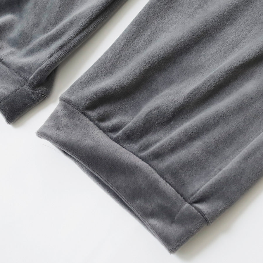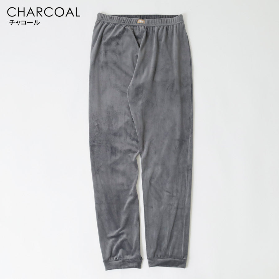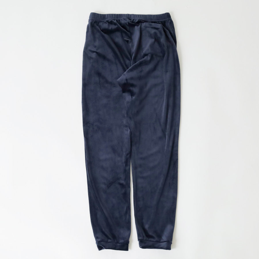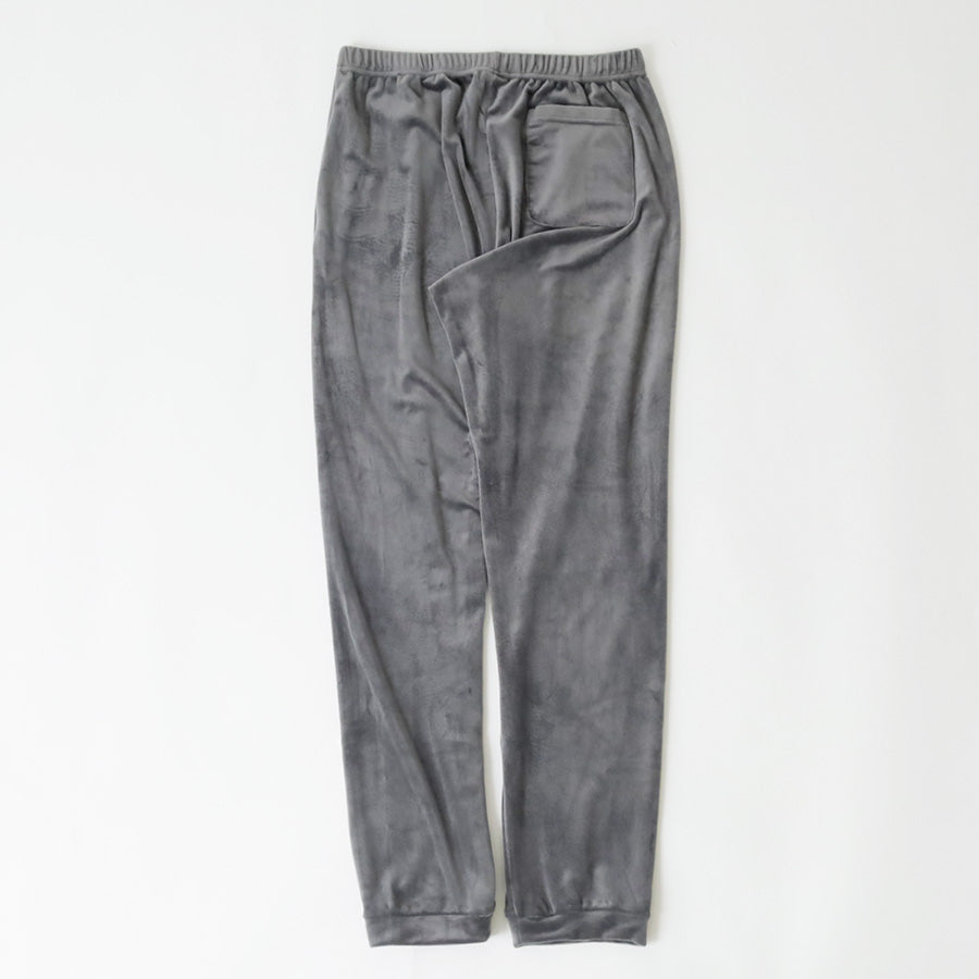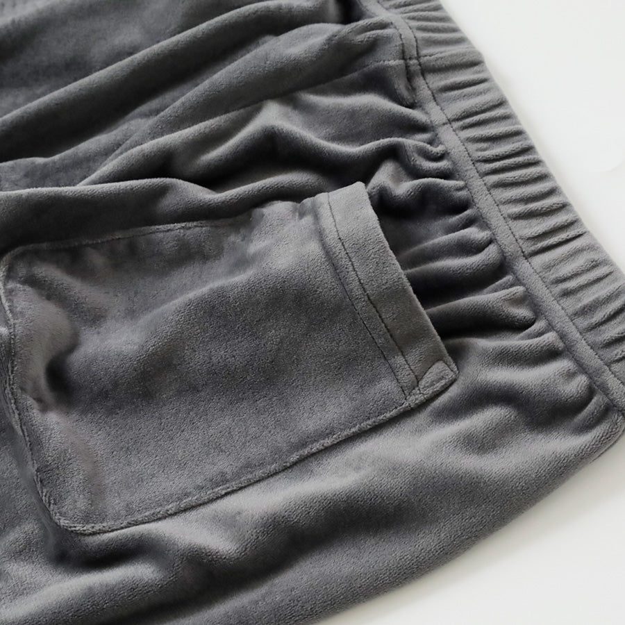 ウエストは伸縮性のあるゴム仕様で、前面にはブランドタグをワンポイントで配置。バックには便利なポケットが1つ付いており、ちょっとした収納にも活躍します。ベロア調ならではの上品な風合いがありながら、リラックスした雰囲気を兼ね備えた一本です。カラーは落ち着きのあるチャコールとネイビーの2色展開。